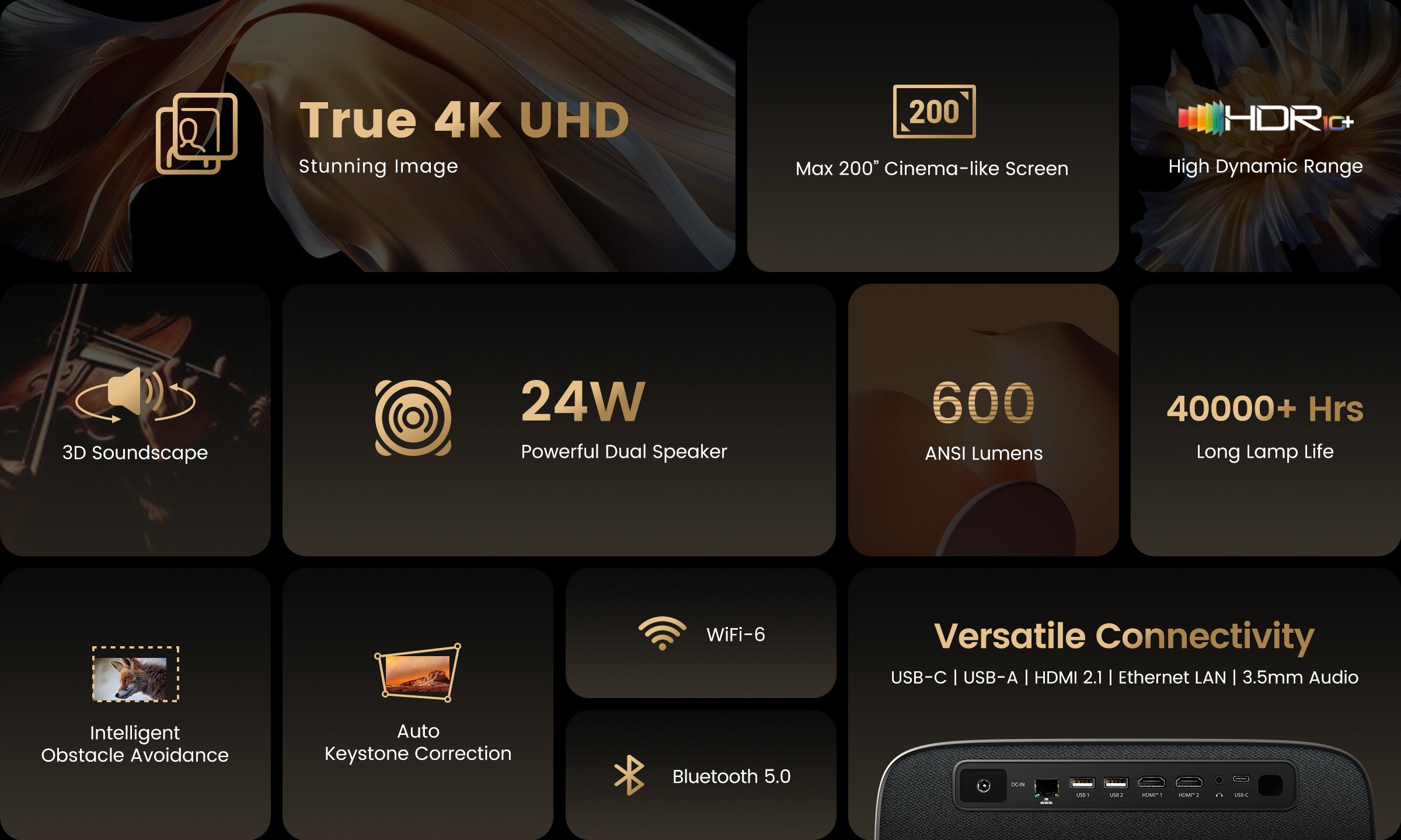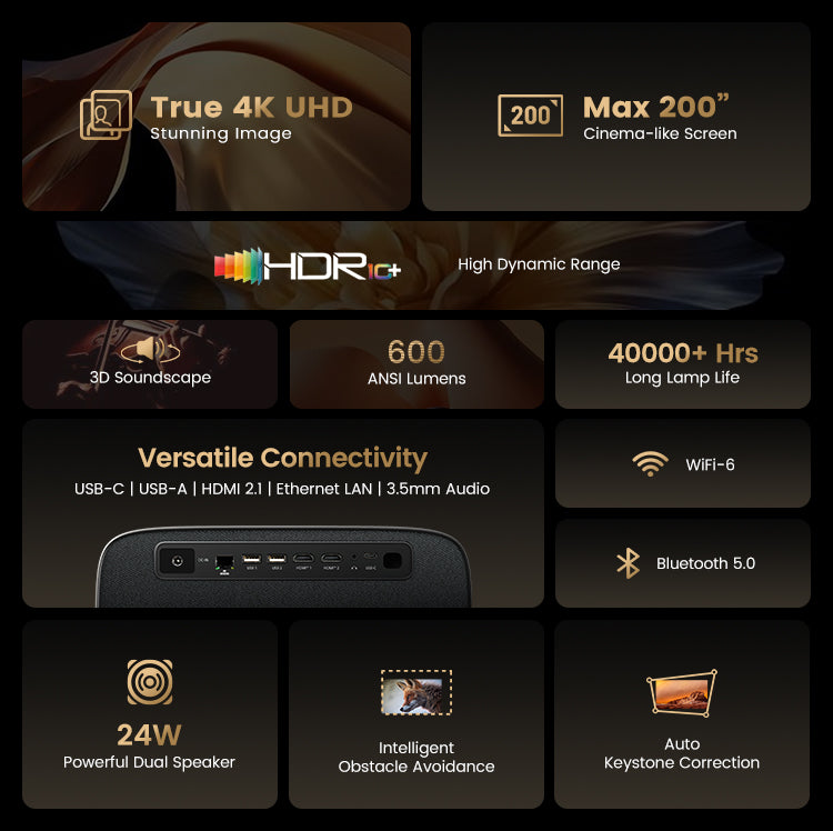 - True 4K UHD with Native 3840*2160 Resolution, HDR 10+ and Up to 600 ANSI Lumens