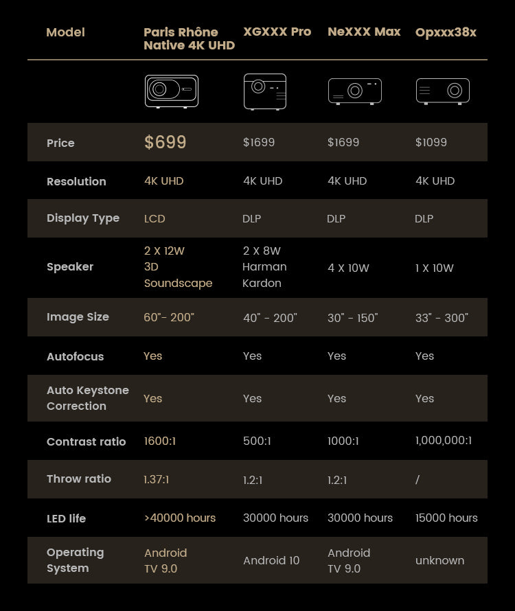 What is the contrast ratio of the Paris Rhône 4K projector?