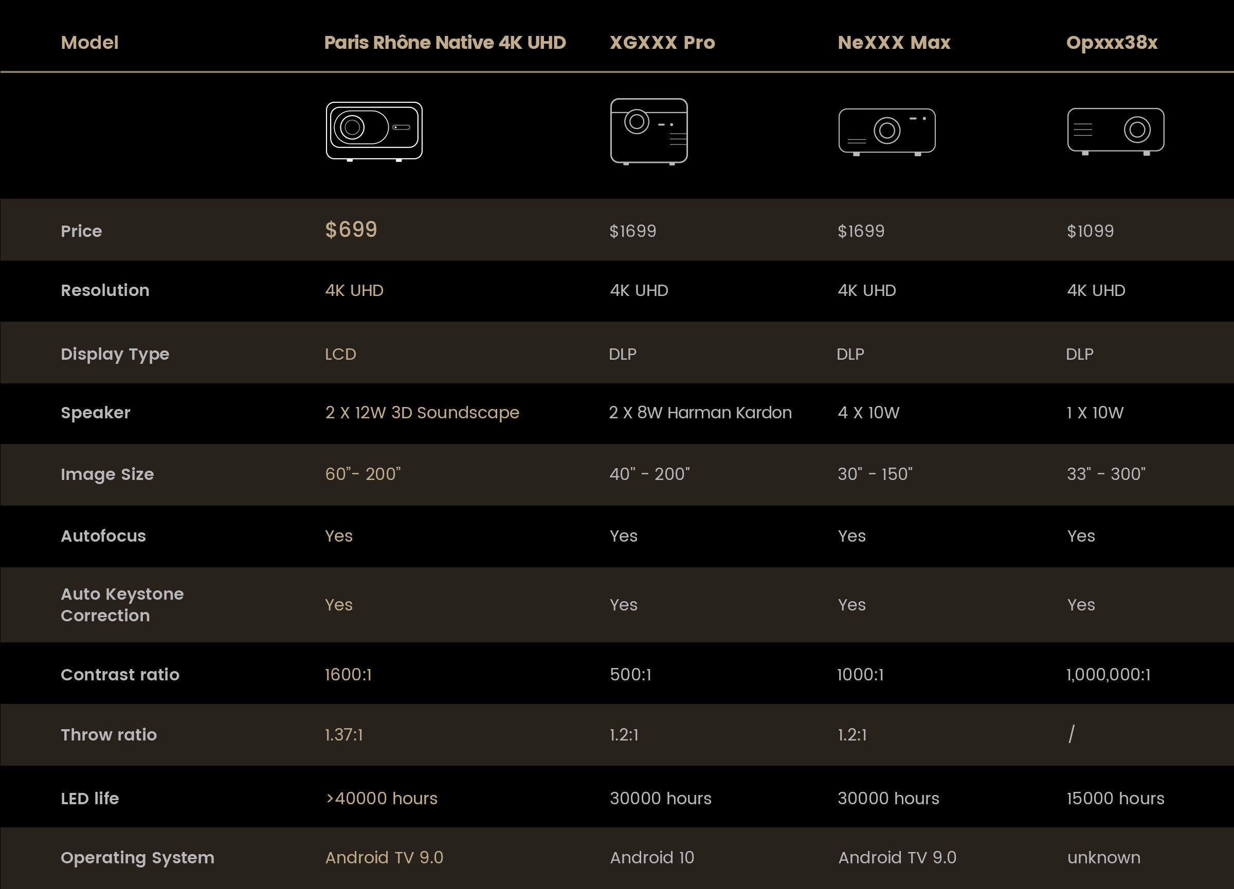 The Paris Rhône 4K projector has a contrast ratio of 1500:1.